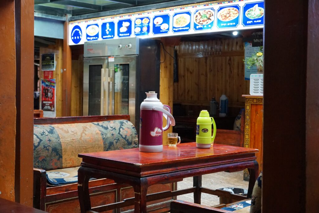 Avant d’atteindre la place principale, on tombe par hasard sur une teahouse achalandée de tibétains buvant du thé au lait.