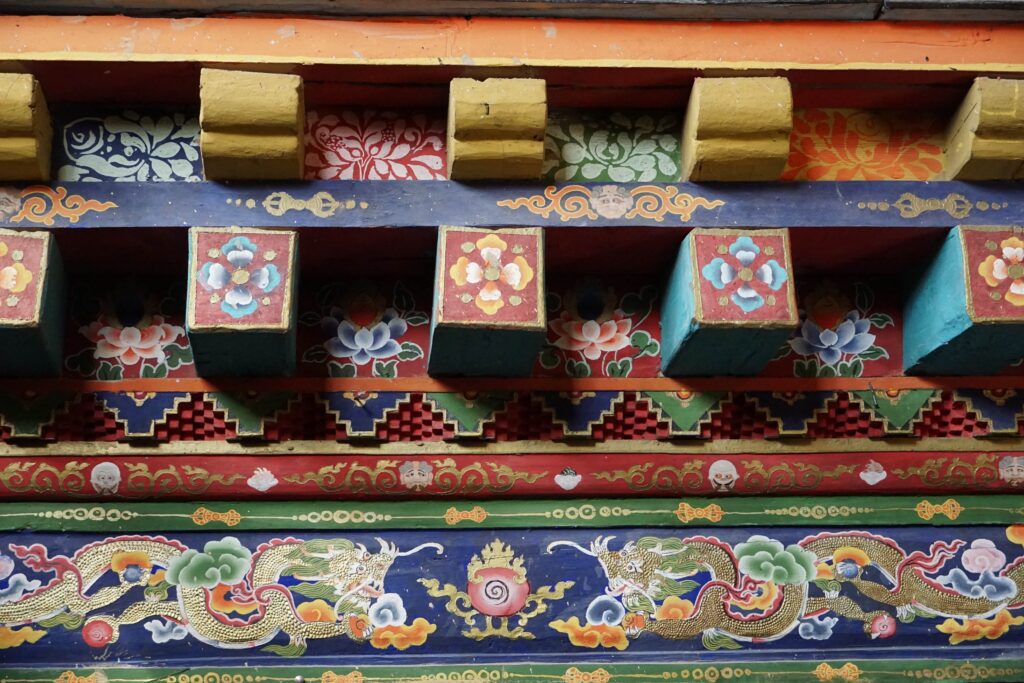 Les murs en pierres blanchies de chaux. Les fleurs peintes à la main sur les linteaux de bois. Les fenêtres drapées d’ornières claquant au vent, leurs pourtours noirs. Les portes rouges cramoisies et leurs poignées à anneaux tombants. Les poteaux de prières auxquels sont enroulés des lungta – ces banderoles de drapeaux colorés ornés de mantra bouddhistes. Les toits dorés aux angles relevés.
