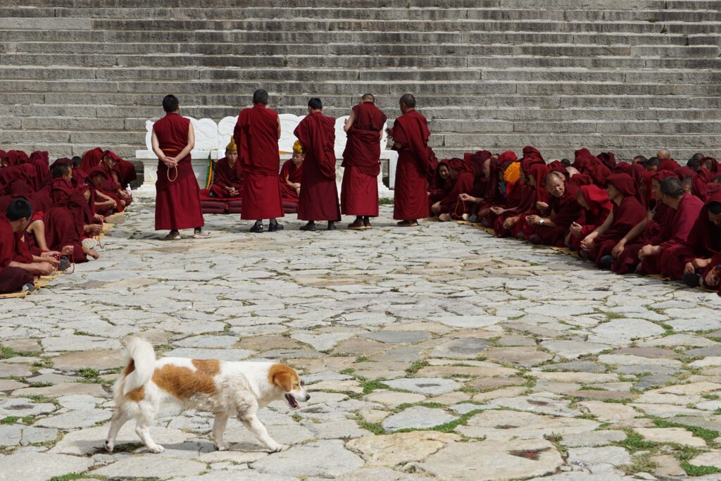 Devant nous, sur le parvis, les apprentis moines remballent avec empressement les tapis sur lesquels ils se tenaient en rangées bien droites quelques secondes plus tôt. On vient d’assister à un examen bouddhiste en bonne et due forme.