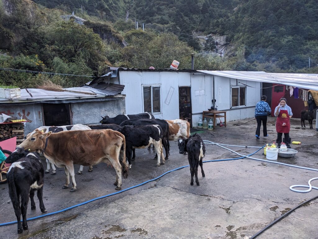 Dorje qui complimente le mélange d’encens notre hôtesse et s’en sert un sac pour ramener la maison. Deux policiers, venus se chercher un petit déjeuner, qui engloutissent un bol de nouilles instantanées épicés en faisant descendre le tout avec une bonne tasse de lait chaud. La fille aînée qui balaie le sol distraitement. Le paternel qui chasse les (trop) nombreuses vaches passant leurs têtes par l’embrasure de la porte d’entrée.