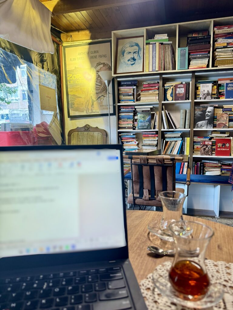 Il faut dire qu’on ne s’attendait pas à entendre sa voix résonner dans une petite librairie seconde-main slash salon de thé dans Kediköy.